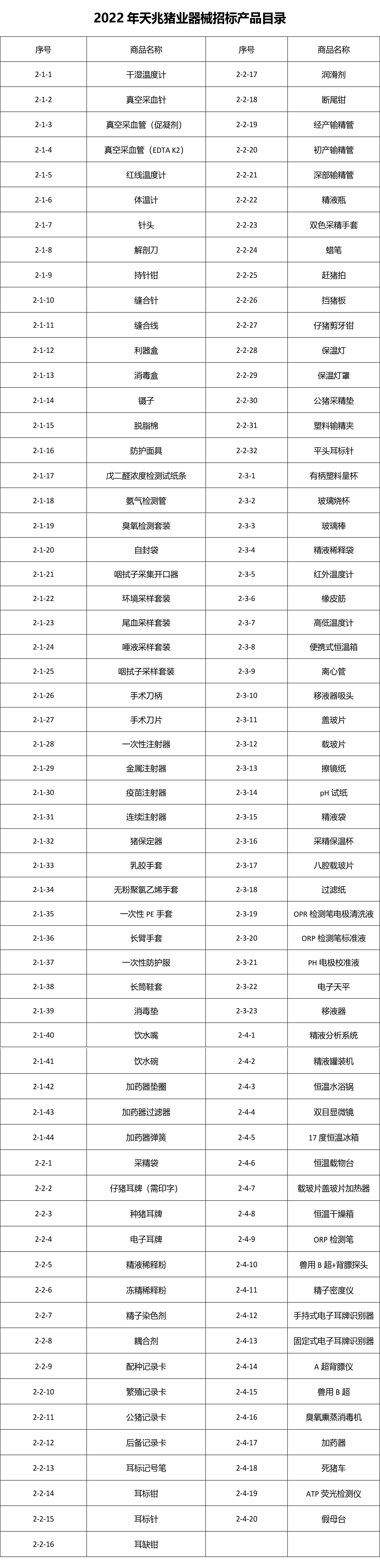 豬場內(nèi)獸醫(yī)、生物安全、生產(chǎn)及育種相關(guān),精液檢測實(shí)驗(yàn)室用器械、耗材、試劑和儀器設(shè)備等。招標(biāo)產(chǎn)品參見附件《2022年天兆豬業(yè)實(shí)器械招標(biāo)產(chǎn)品目錄》,但不僅限于附表。