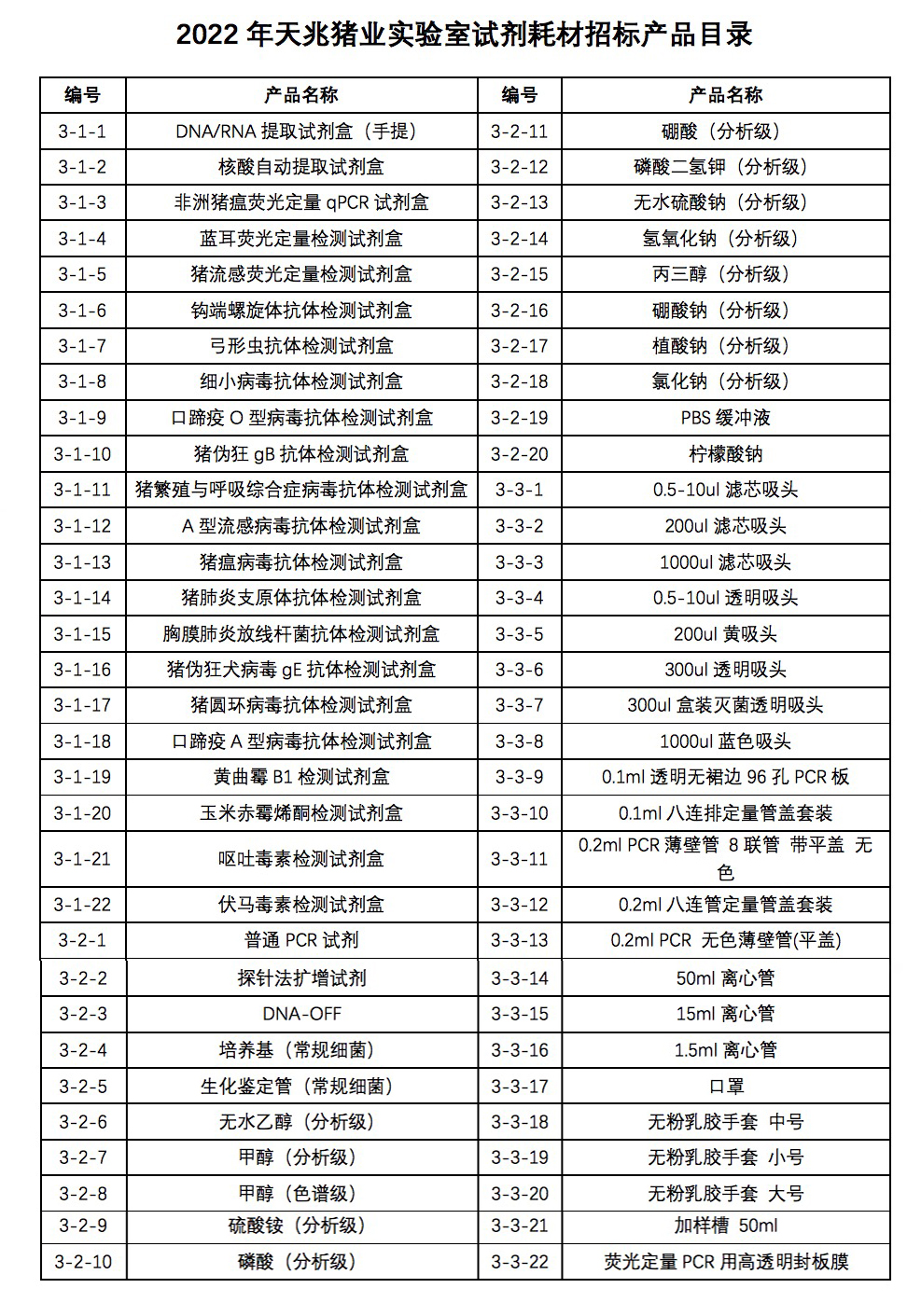 試劑、試劑盒、實驗室耗材等實驗室日常消耗相關物資。招標產品參見附件《2022年天兆豬業實驗室試劑耗材招標產品目錄》,但不僅限于附表。
