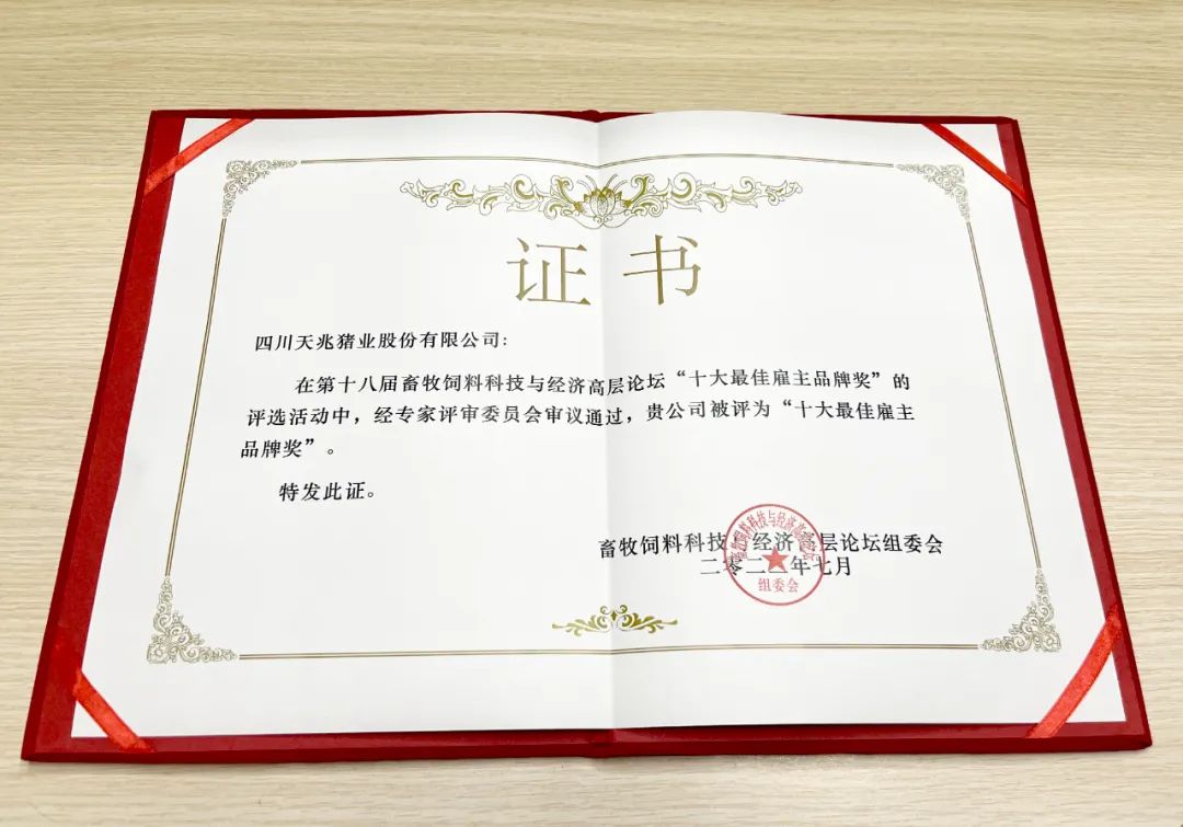 在論壇期間舉辦的頒獎盛典上,天兆豬業(yè)獲評“十大最佳雇主品牌獎”。